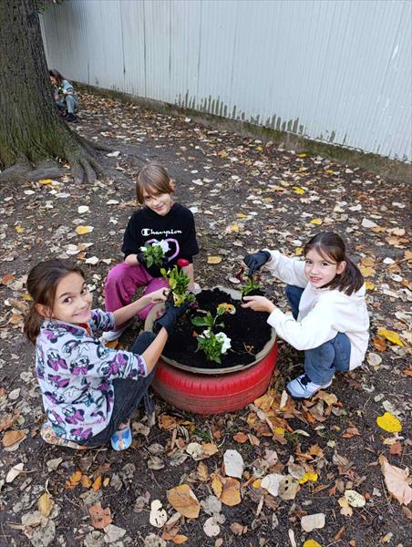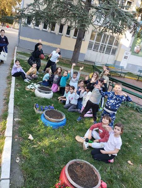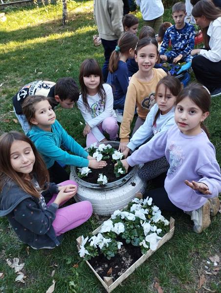САДЊА ЦВЕЋА Ученици првог и другог разреда у оквиру еколошке секције уређивали су школско двориште. Девојчице су садиле цвеће, које нам је донирала општина Савски венац, а дечаци су се потрудили да покупе отпатке. На тај начин су заједнички учинили да школско двориште процвета и заблиста. 12.11.2025.