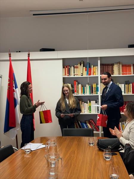 Прво место на Франкофоном диктату Са великим поносом објављујемо да је наша ученица Петра Станишић освојила прво место на Франкофоном диктату у нашој школи. Као награду, Петра је имала прилику да посети Амбасаду Швајцарске, где је присуствовала свечаној додели награда. Током посете, ученике је водила Cecilia, представница Француског института. У пријатној и свечаној атмосфери, разговарало се на француском језику о различитим темама, а затим је уследила додела диплома и награда, као и заједничко фотографисање. Честитамо Петри на изузетном успеху и достојном представљању наше школе! Prebaci u latinicu Cécilia Prebaci u latinicu Cécilia 06.04.2026.